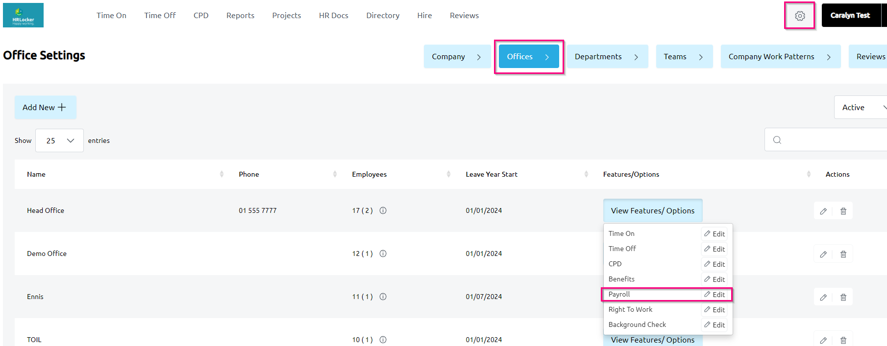 - In the Office Features dropdown, select Payroll.