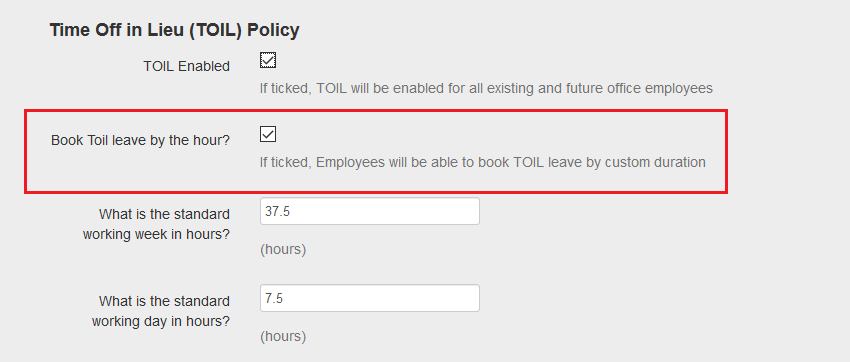 Under TOIL Policy there is an option to Book TOIL Leave by the hour. This will give employees the option to book TOIL by the hour (custom duration) rather than only half day and full day.