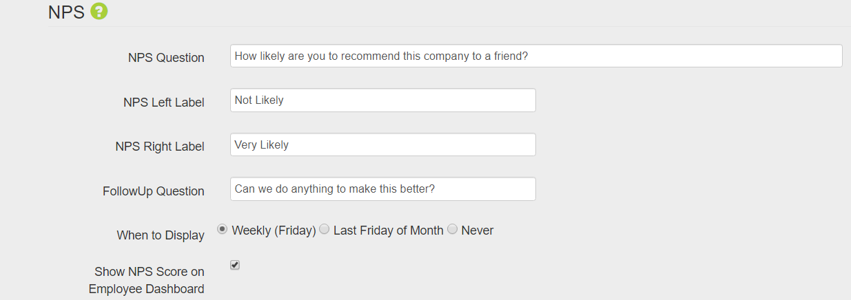 - When employees answer the question, they will be asked the follow-up question. They need to enter a response and press submit. Their response will be captured and displayed as an NPS score on the dashboard.
