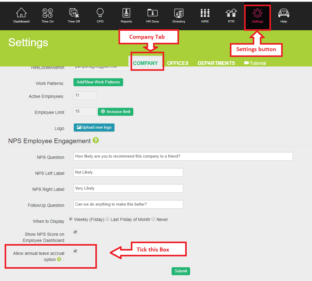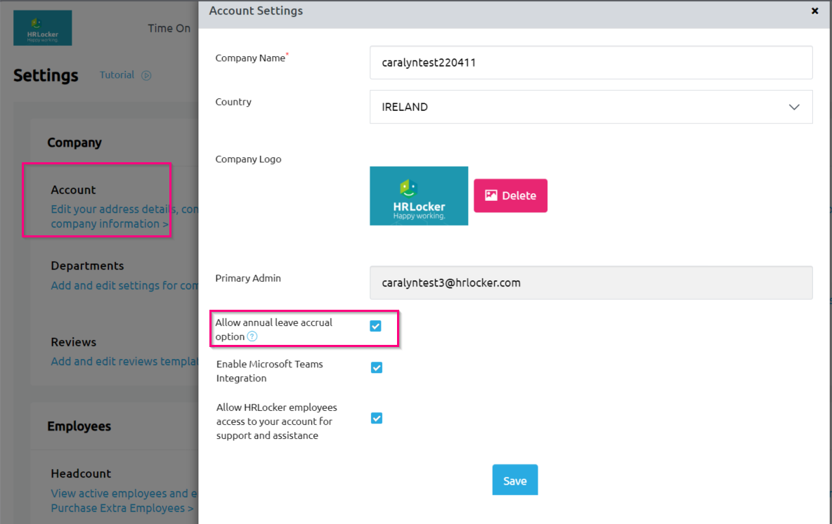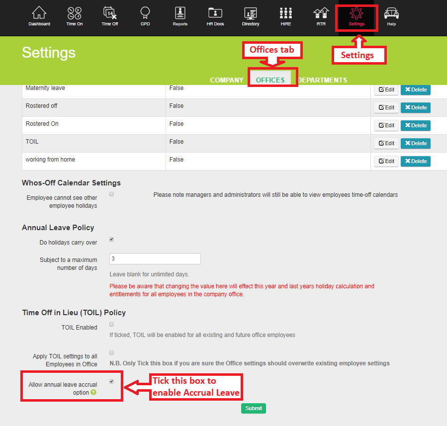 - Scroll to the bottom of the page and tick Allow annual leave accrual option.