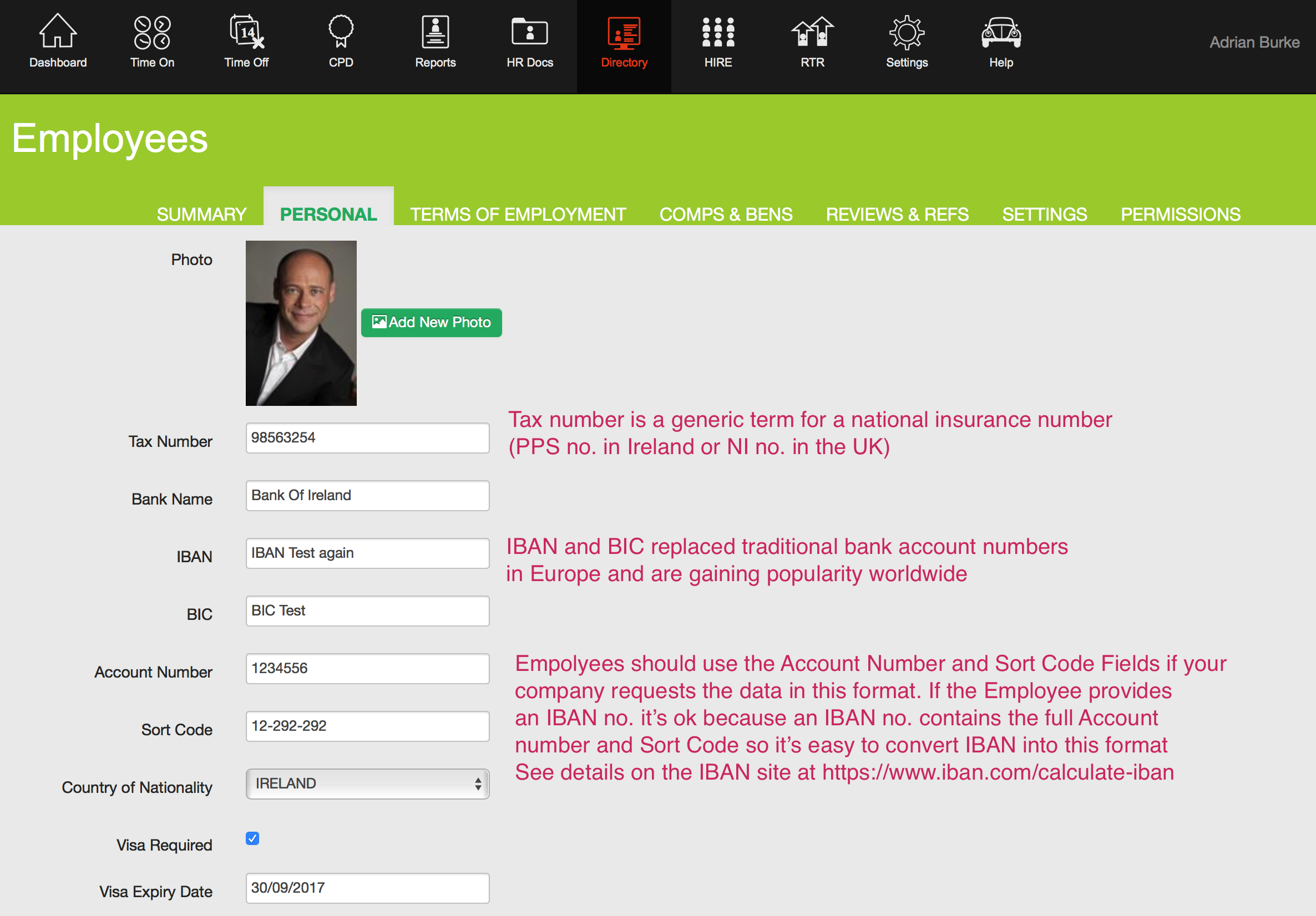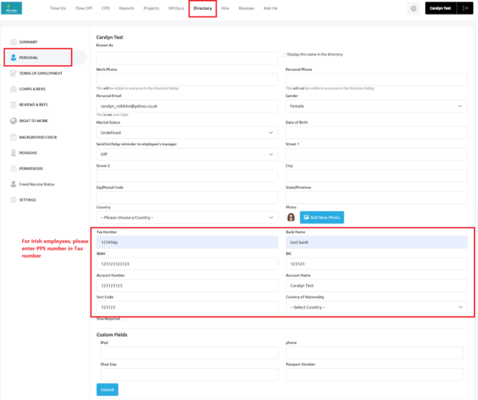Personal tab, Update bank details, PPS Number, IBAN, BIC, Bank Account, Sort Codes, National Insurance Number