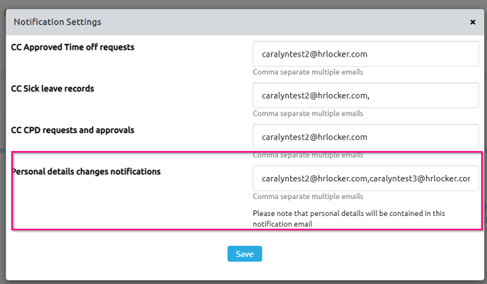 Changes made to the employee's Personal Tab prompt notifications to the email addresses set in the Personal Details notification settings. This is available in the Settings page in Notifications
