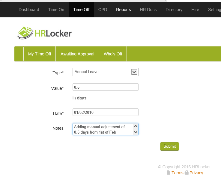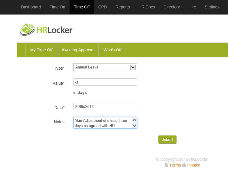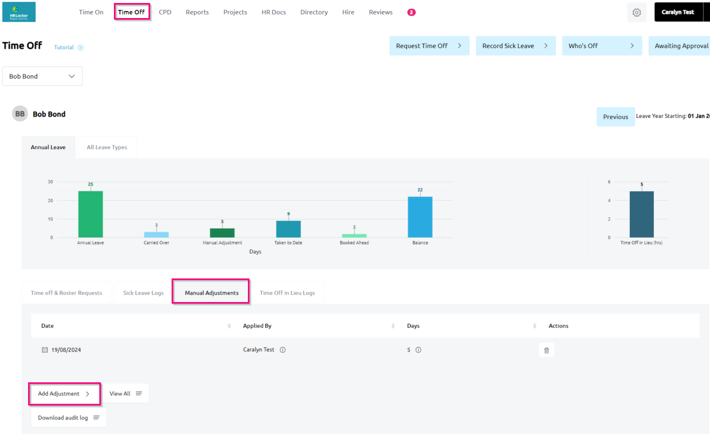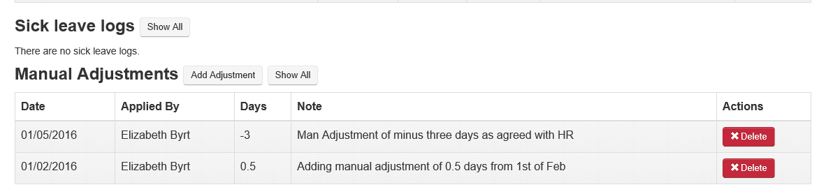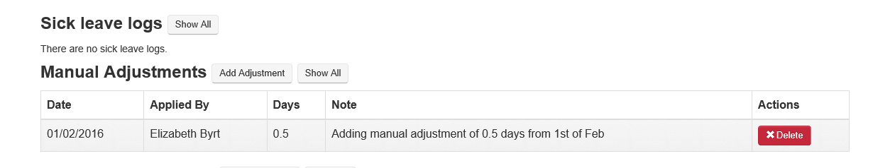 - After entering the details, submit the adjustment. It will be logged in the Manual Adjustment Log for the current leave year.
