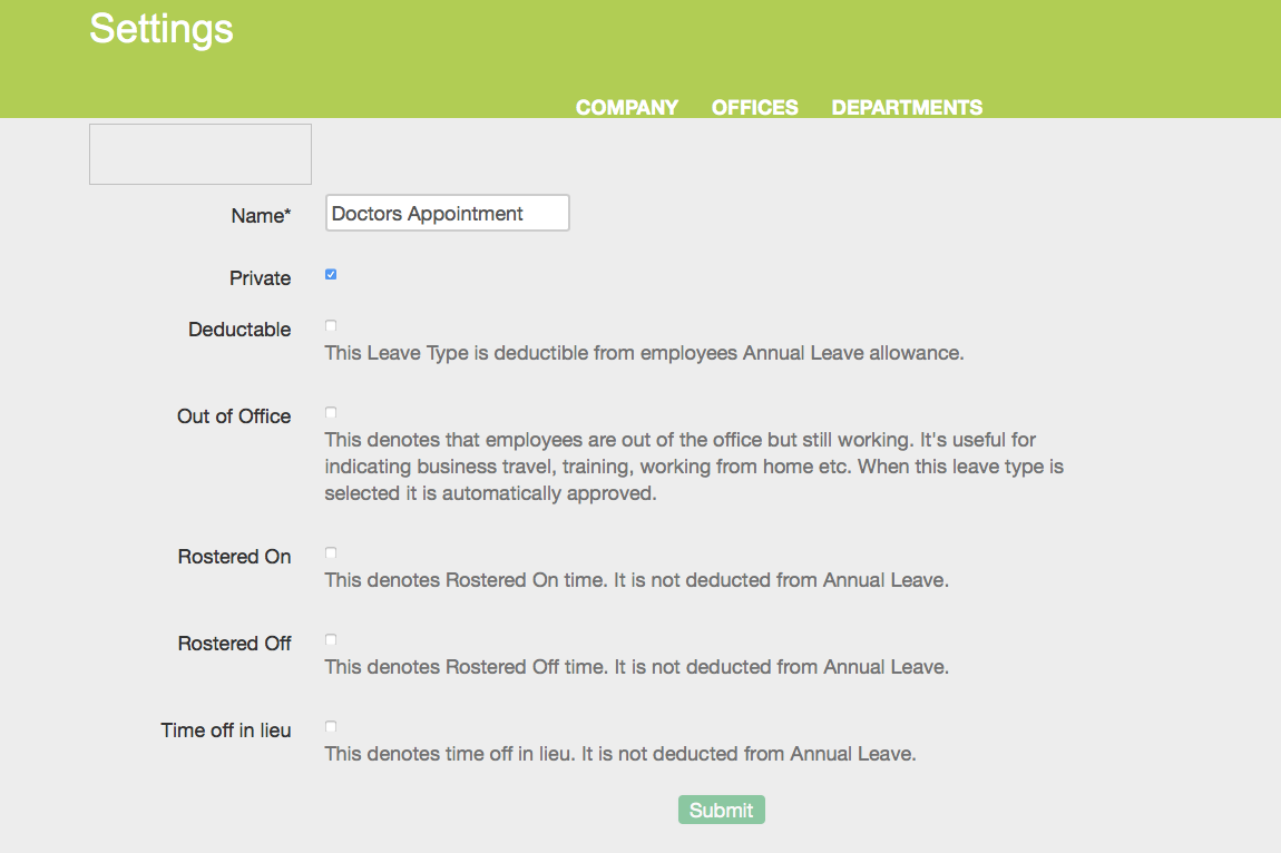 - If wanting to create a sick leave type please see Creating Sick Leave types in Offices