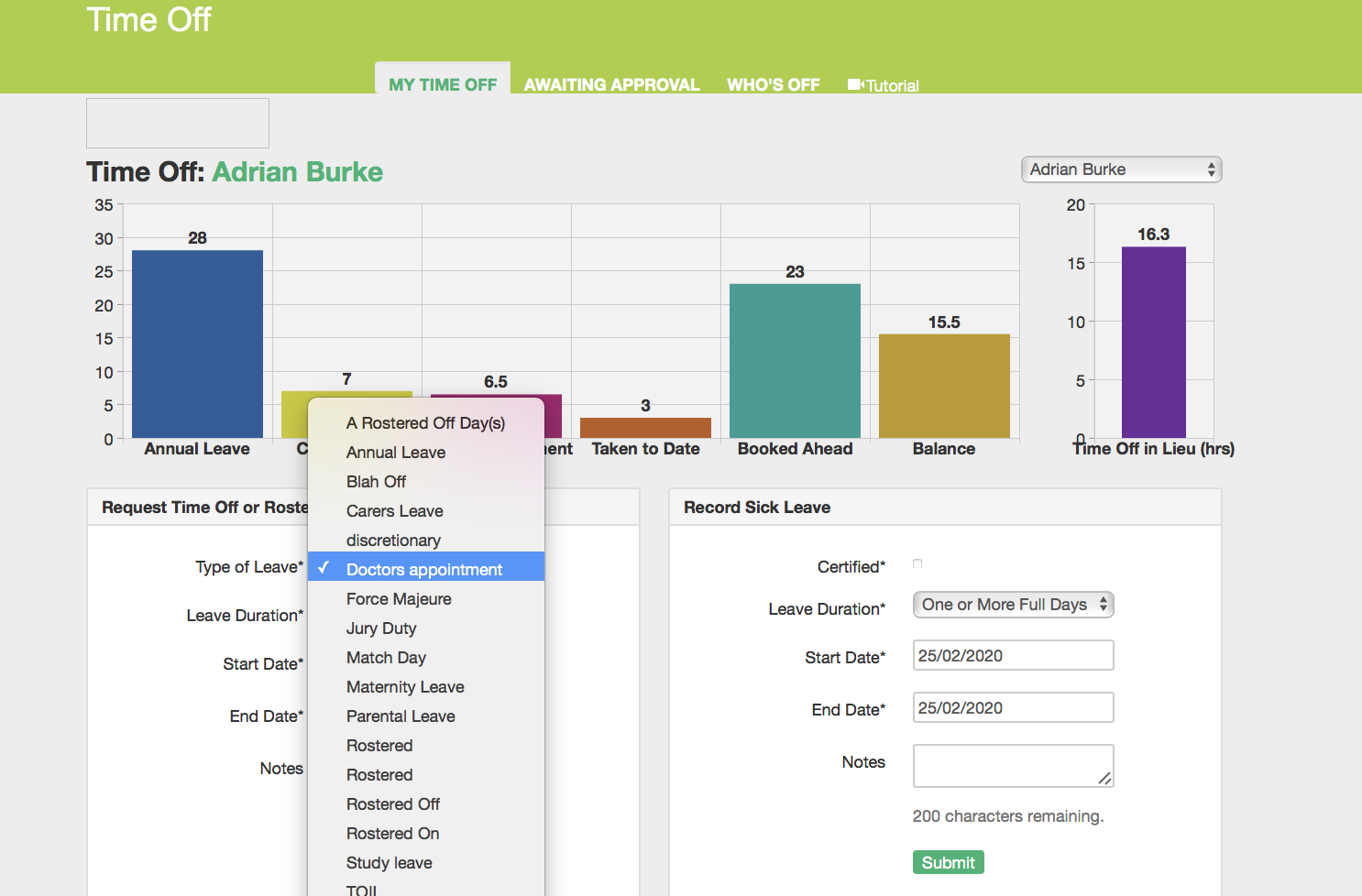 - Select from a range of leave types, from choosing whether it deducts from annual leave balance to assigning it as 'out of office'.