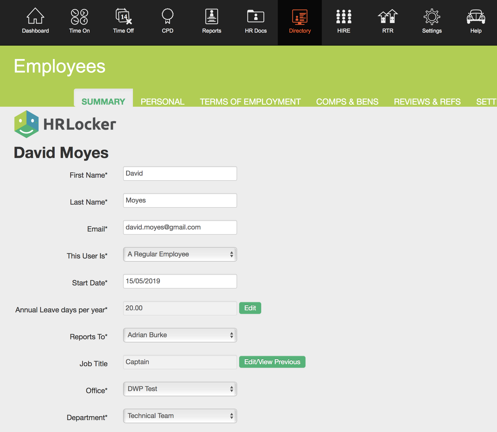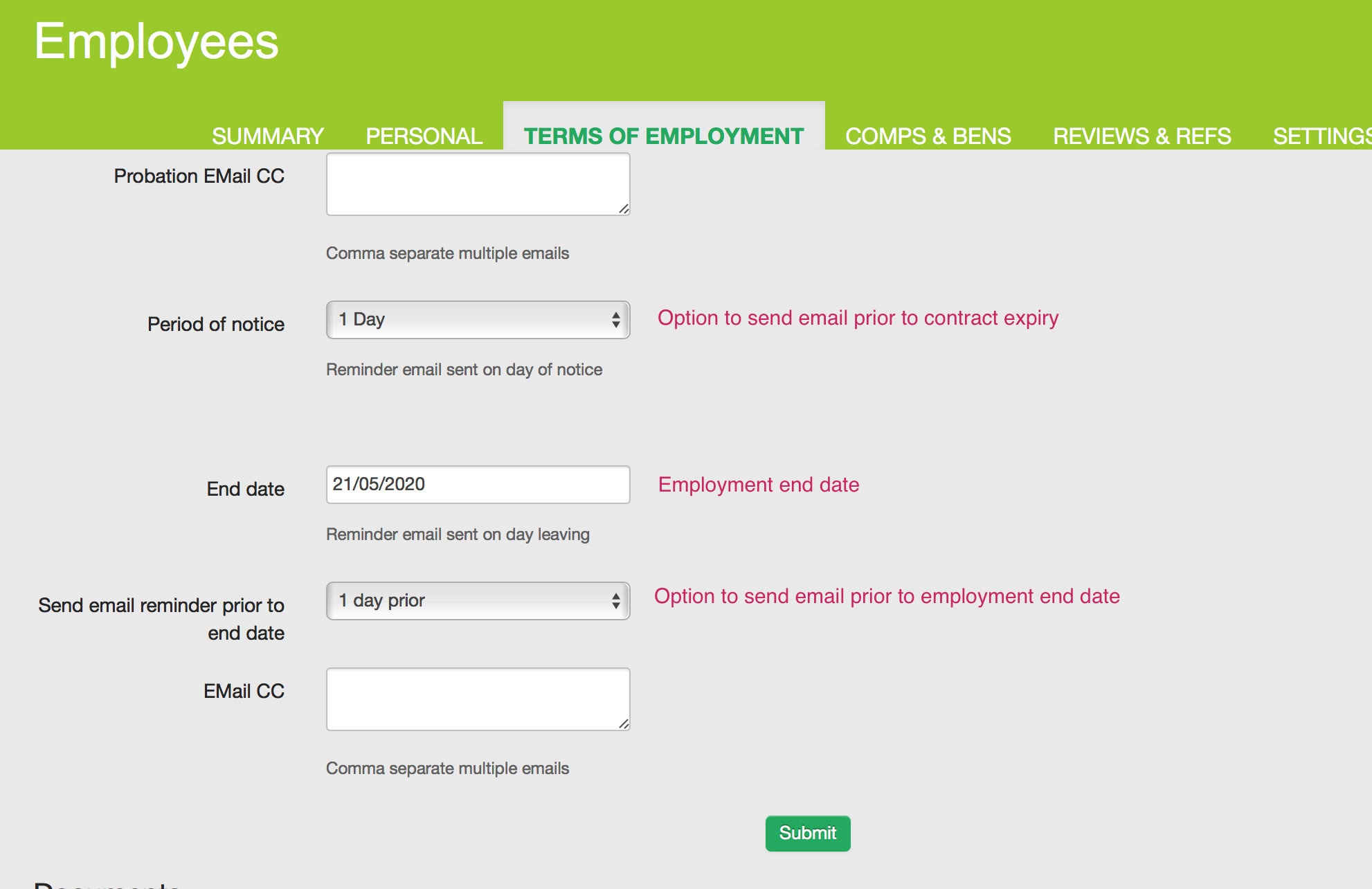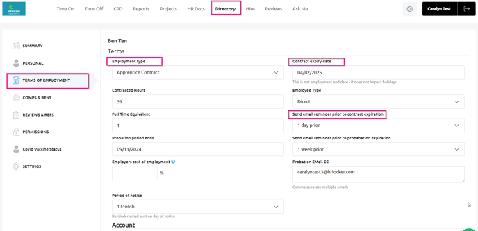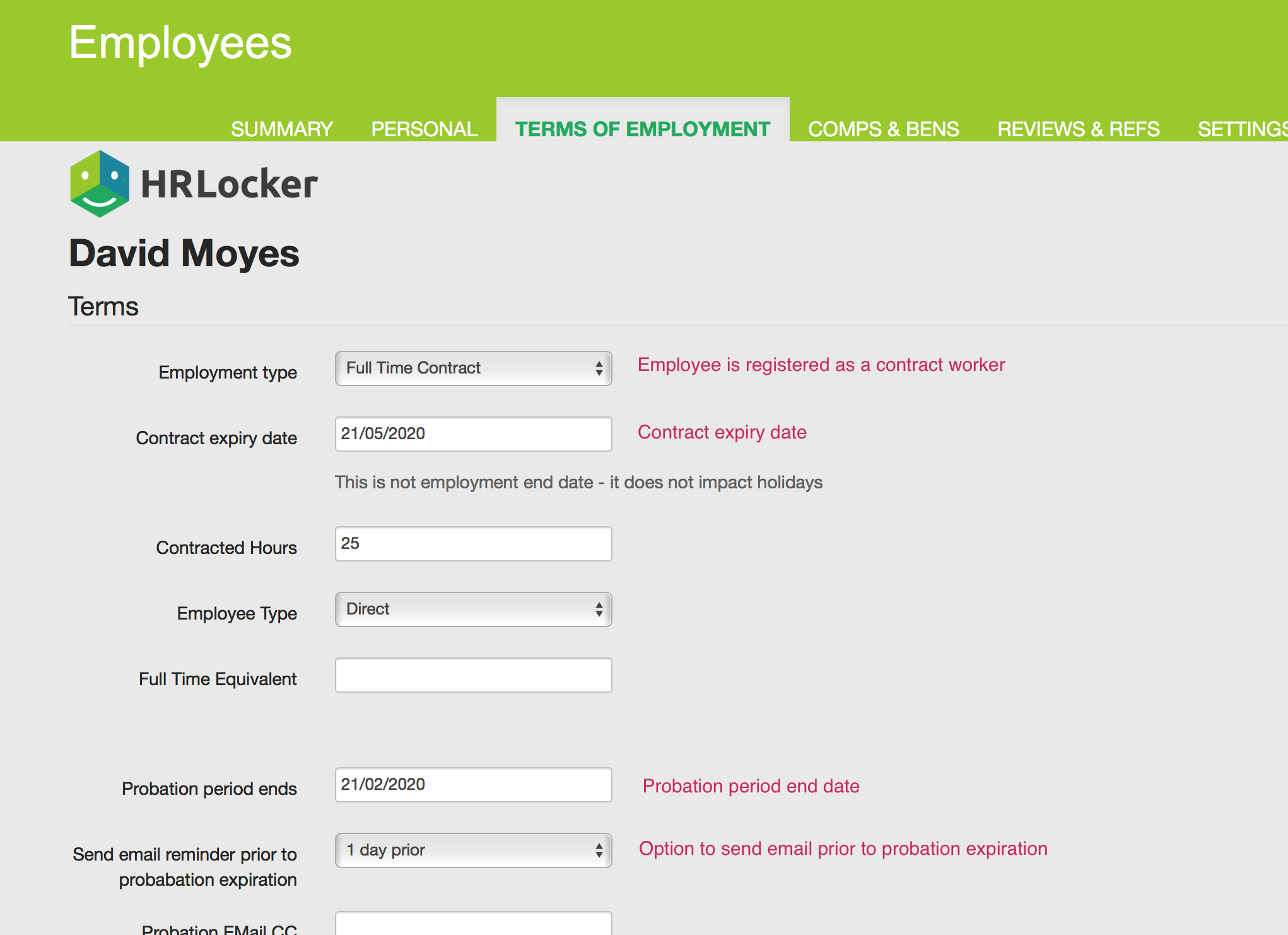 Within the Terms of Employment, admins can adjust various end dates, including Contract Expiry, Probation Period, and Employment End Date.