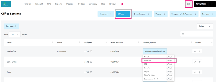 - Select Time Off settings for the relevant office