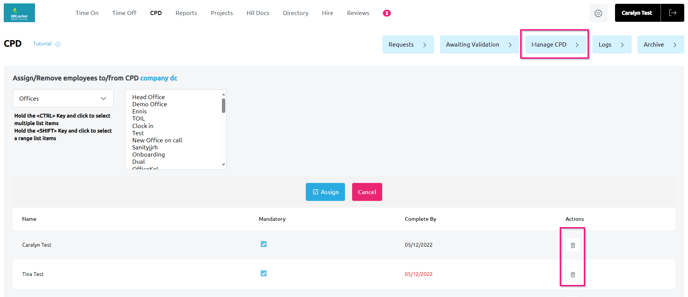 - Go to "Manage CPD" and click "Assign" for the CPD item you wish to delete.