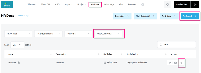 - If the document should not be used at all, find it in the Archived section and select Delete to permanently remove it from HRLocker.