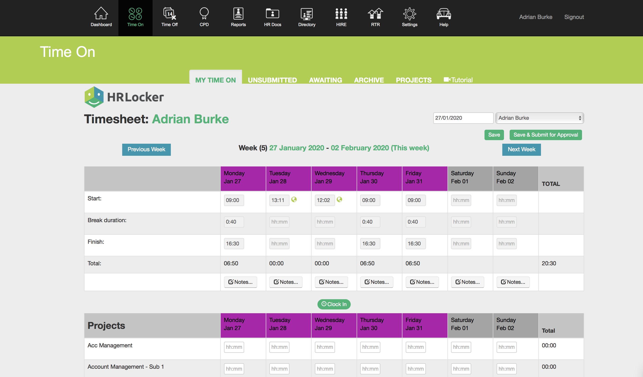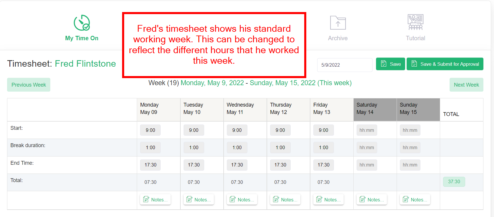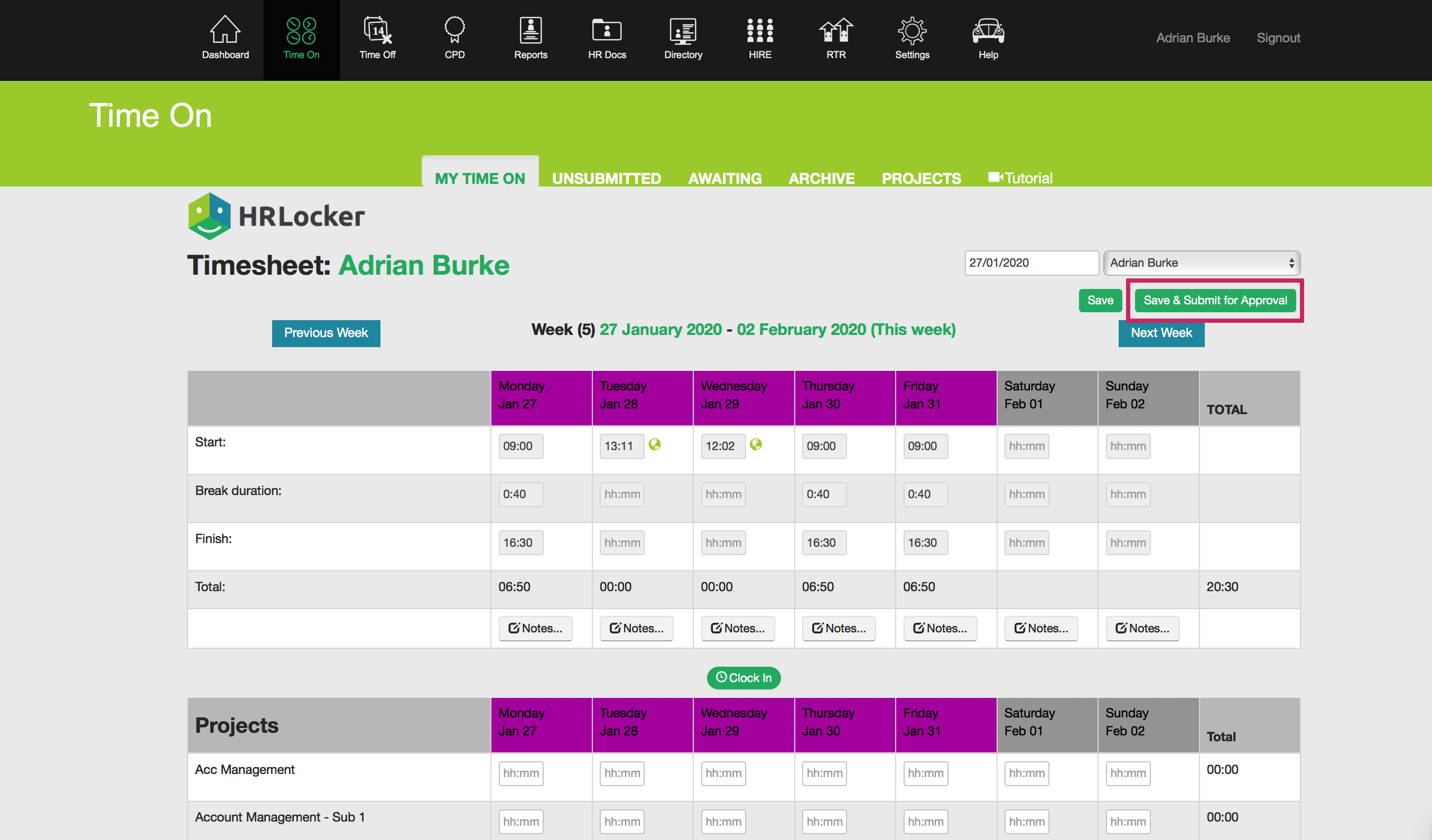 Once the timesheet is complete for the week, the employee must submit it for approval.