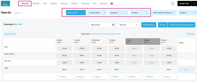Default Timesheet View: Upon accessing the 'My Time On' section, your view will default to your own current timesheet, which corresponds to the current date.