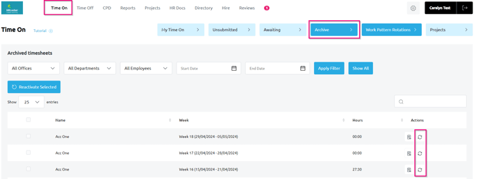 - Once you locate the timesheet, click on the option to Reactivate it. This action will move the timesheet out of the archive and allow it to be edited.