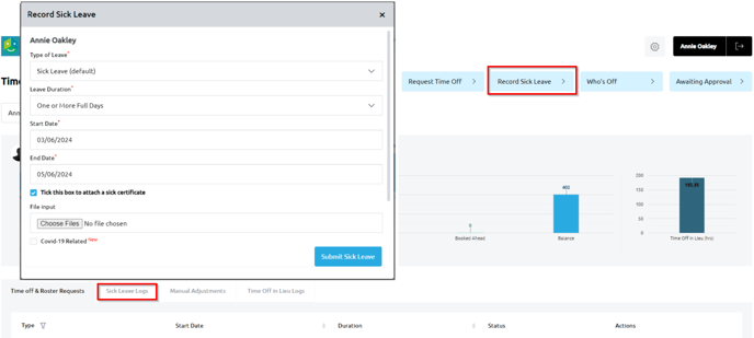- Once recorded, your sick leave will appear in the Sick Leave Log. This log keeps a detailed record of all your sick leave entries.