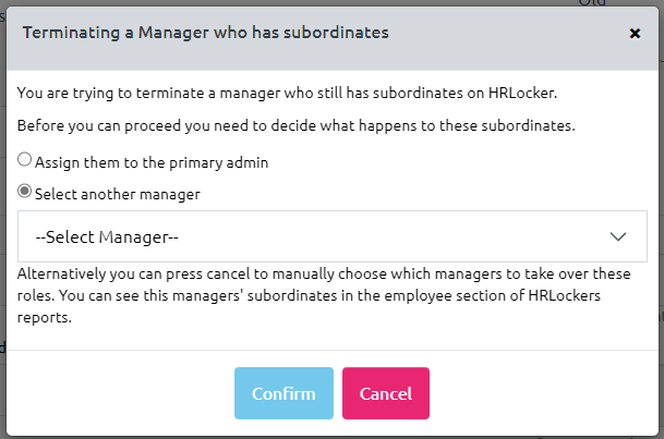 - If the manager has subordinates, a message will appear after submitting the termination date. Select either the primary administrator or another manager from the dropdown list in the pop-up.
