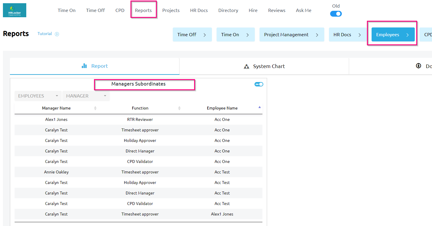 - Under the Employee section in reports, you can view the list of Managers' Subordinates, filtered by employee or manager.