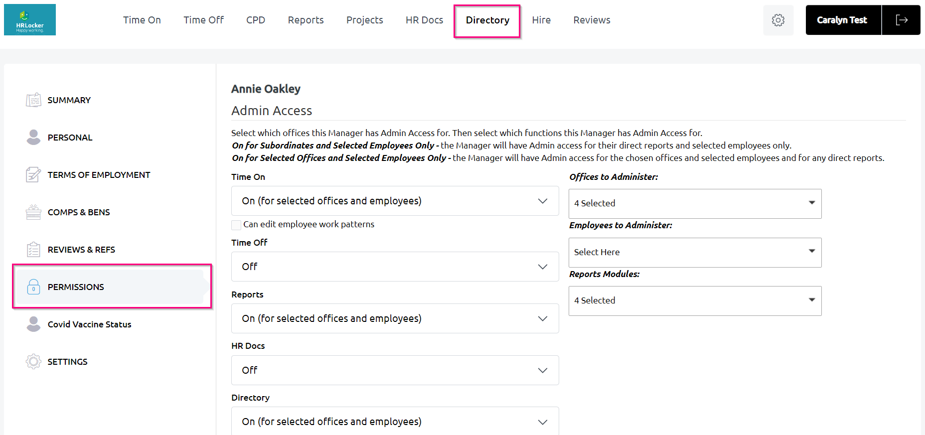 This permission provides a broader scope, allowing managers to have administrative access to employees across multiple offices as well as selected employees. It is useful when a manager oversees operations across different offices or locations and needs the ability to manage the HR activities for employees within these areas.