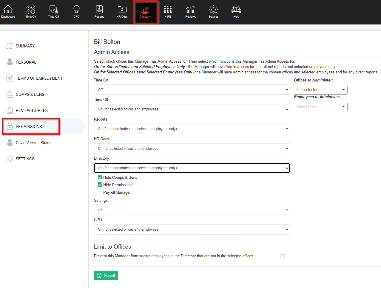 - Only assign the selected offices permission if the manager needs to manage employees across multiple offices. For direct team management, the subordinates and selected employees setting is typically sufficient.