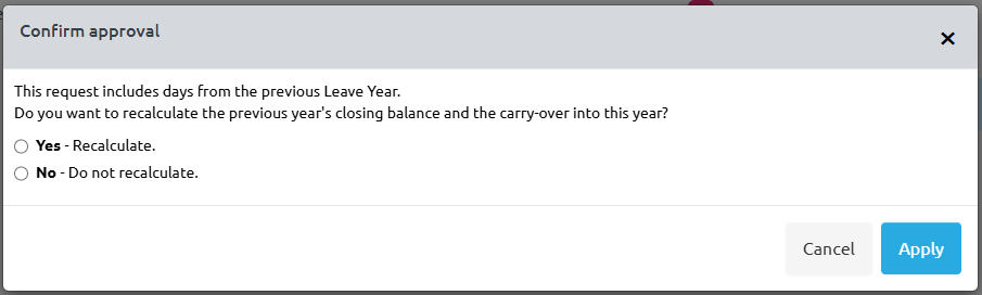 When a manager approves annual leave that falls into the previous leave year, HRLocker displays a confirmation pop-up with two options: