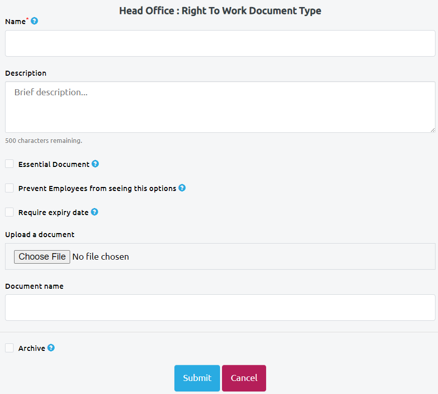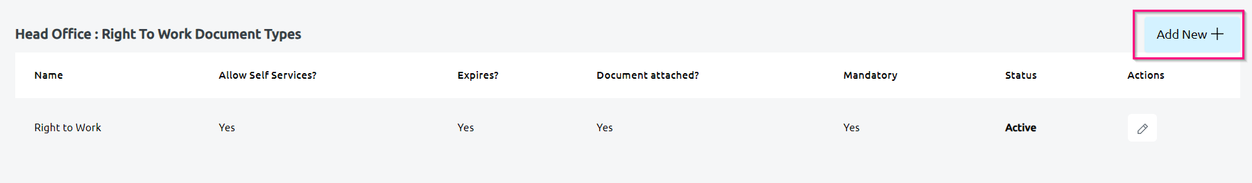 You can add and configure different document types that employees need to provide as proof of their right to work. Each document type can have specific settings: