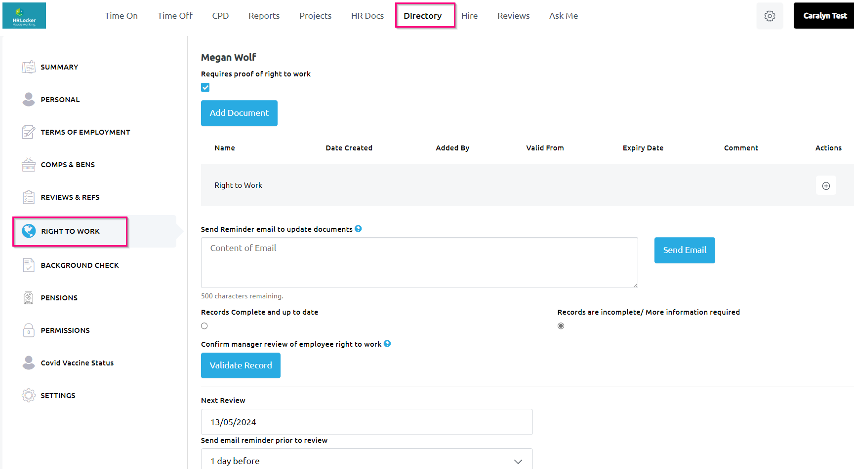 - Add Documents/Records: Allows you to upload new right to work documents.