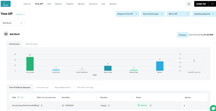 • Managers can view the Time Off screen for selected employees, providing an overview of their leave status.